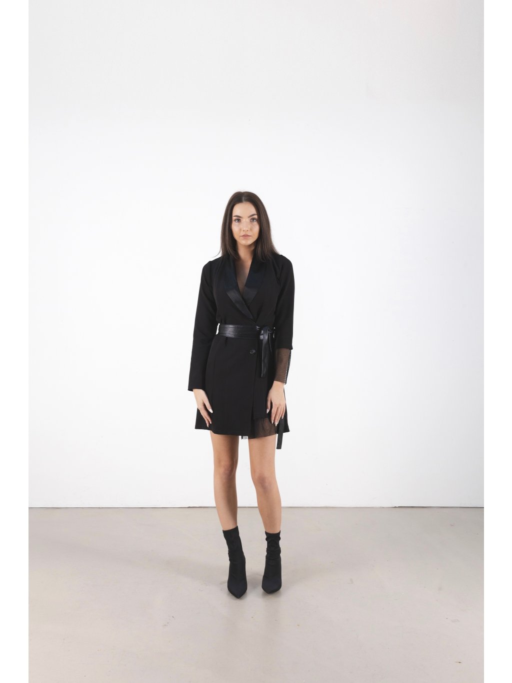 Přinášíme tyto elegantní šaty s sakem, které mají asymetrický střih. Jeden rukáv a část sukně jsou vyrobeny z průhledné látky, čímž vytváří zajímavý efekt. Šaty se zapínají pomocí knoflíků a můžete je doplnit koženým páskem, který jim dodá výrazný vzhled. S těmito elegantními šaty budete na každé události vypadat ohromující.