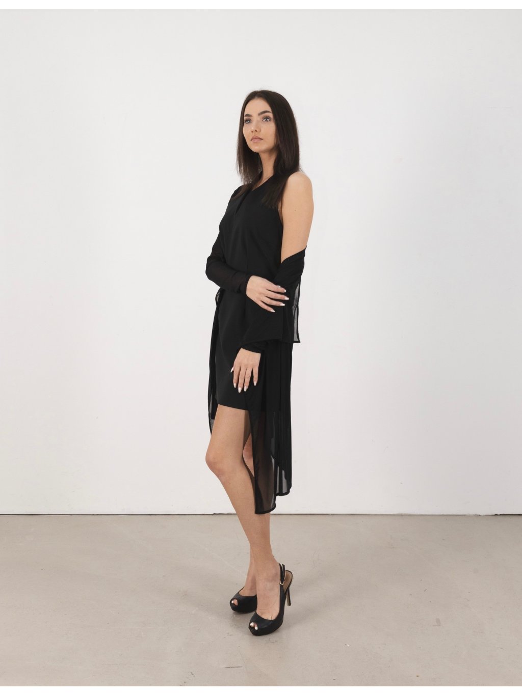 Černé koktejlové šaty, které jsou dokonale doplněny síťovaným kardiganem a koženým páskem.K tomu krásný síťovaný kardigan! Tento netradiční doplněk dodá vašemu outfitu moderní nádech a pohodlný pocit. Síťovaný vzor přidá šaty další vrstvu textury a zajímavosti, čímž vytvoříte jedinečný a výrazný vzhled. Kožený pásek poslouží jako skvělý kontrast k jemnosti šatů a kardiganu a zajistí, že budete vypadat elegantně a vkusně.