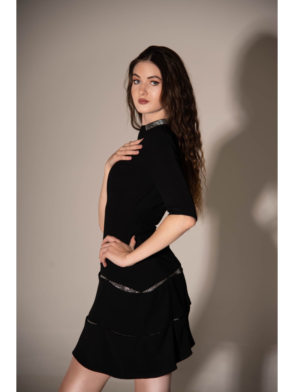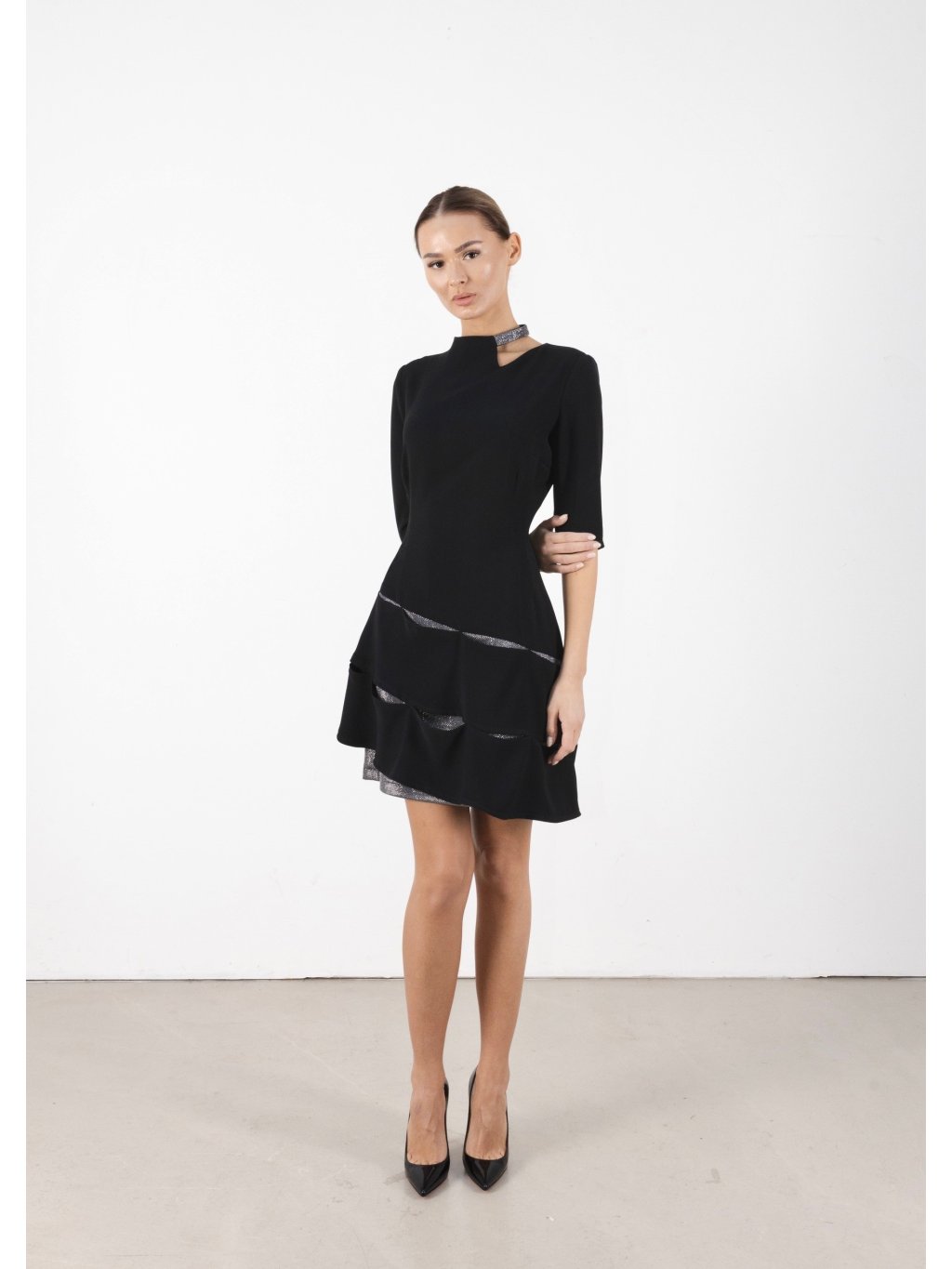 Černé šaty s rafinovanou sukní jsou skutečnou lahůdkou pro vaše šatníky. Sukně je zdobena jemnými volánky, které dodávají šatům ženskost a lehkost. Umístěné na stříbrné látce vytvářejí efektní kontrast a přidávají šatům jedinečný vzhled. Na krku šatů je vytvořen efekt stříbrného náramku, který dodává další zajímavý prvek a zvýrazňuje eleganci šatů. Tyto šaty s nápaditým stříbrným efektem budou skutečným tahákem na každé události.