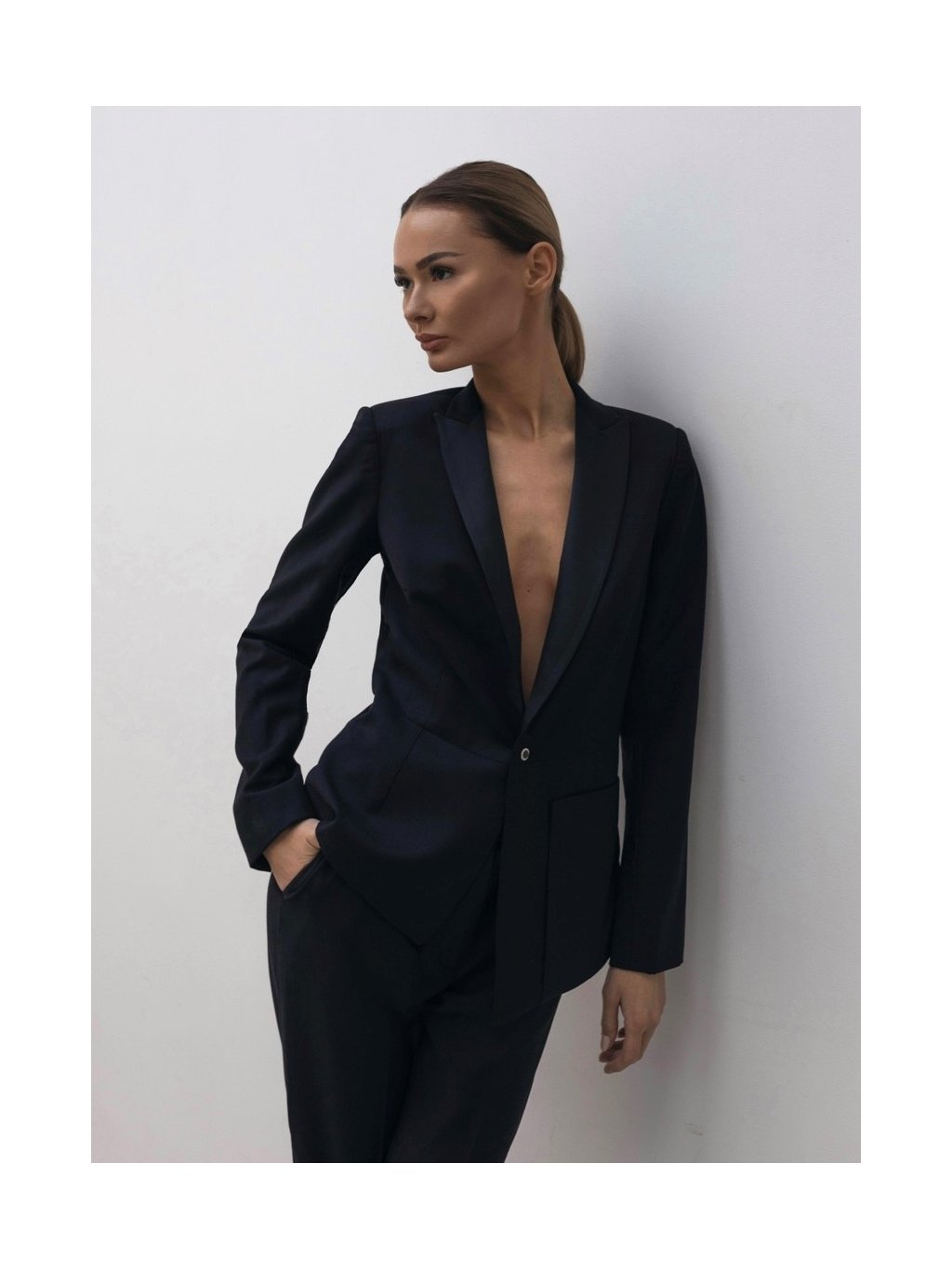 Černý asymetrický kalhotový kostým je skvělou volbou pro ty, kteří nehledají nudu. Tento kostým je zcela odlišný od klasických kostýmů a přináší neotřelý design a jedinečný styl. Sako tohoto kostýmu je vybaveno kapsou na jedné straně, což přidává praktičnost a stylový prvek. Kalhoty mají zajímavý střih na konci, který dodává elegantní vzhled a zvýrazní vaše nohy.