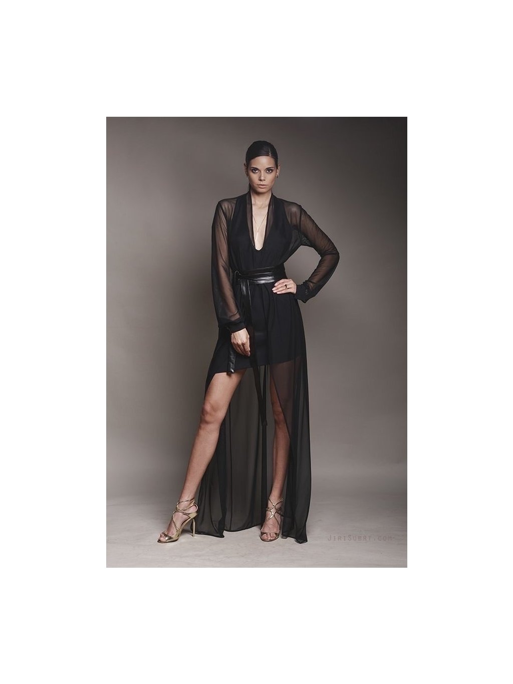 Černý průhledný kardigan s koženým páskem je skvělým doplňkem vaší letní garderoby. Tento stylový kardigan je perfektní volbou pro nadcházející plážové dny. Jeho průhledný design vytváří lehký a vzdušný vzhled, který dodává vašemu outfitu šmrnc. Kožený pásek přidává kontrast a zvýrazní váš pas, což vytváří ženskou siluetu a přidává kabátu sofistikovaný nádech. Tento kardigan je univerzální a můžete ho nosit na plavky nebo jako elegantní příznaní na pláži. Jeho volný střih vám poskytne pohodlí a volnost pohybu.