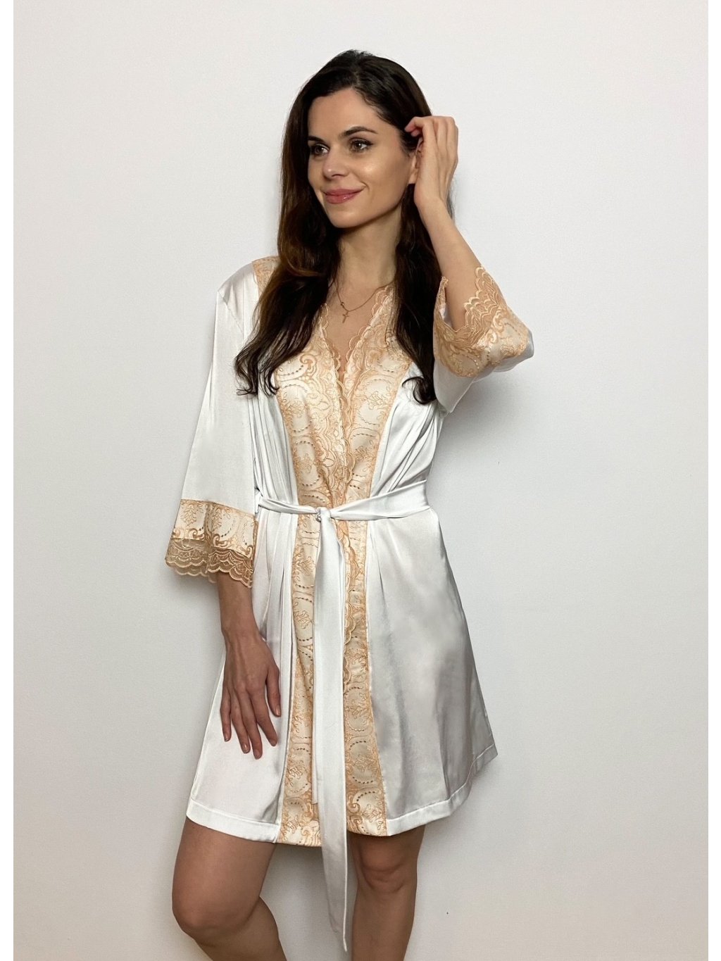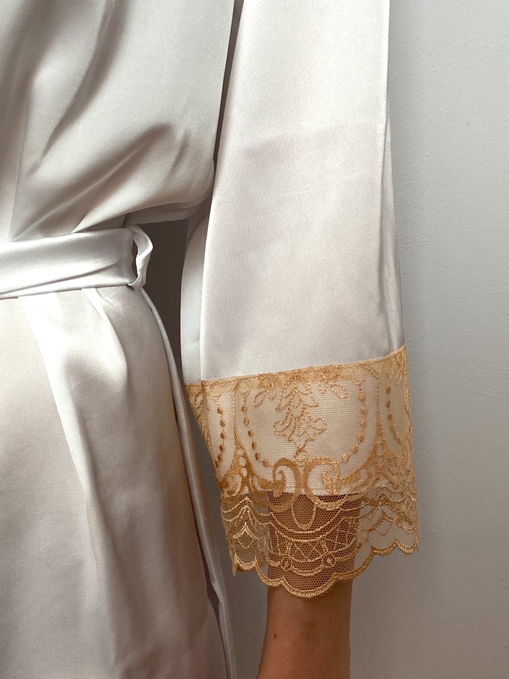 Luxusní župan z přírodního italského saténu se zlatou krajkou z Emirátů je dokonalou kombinací elegance a pohodlí. Jemný, lehký a prodyšný materiál působí hedvábně na pokožce a zajišťuje maximální komfort při nošení. Kvalitní přírodní satén z Itálie dodává županu sofistikovaný lesk a luxusní vzhled, zatímco zdobená zlatá krajka podtrhuje jeho jedinečnost a smyslnost. Tento exkluzivní kousek nejen krásně padne, ale také zvýrazní ženskost a eleganci. Ideální volba pro chvíle odpočinku i výjimečné okamžiky, ve kterých se budete cítit krásná a sebevědomá.